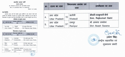 New Delhi, Nov 15: The BJP’s Central Election Committee on Tuesday released a list of candidates for the upcoming Lok Sabha by-election in Uttar Pradesh and the Assembly bypolls in Rajasthan, Bihar, Chattisgarh and Uttar Pradesh