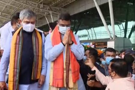 Bhubaneswar : Bharatiya Janata Party (BJP) on Monday launched Jan Ashirwad Yatras from different parts of the country. Thirty nine ministers, who were inducted into the Union council of ministers on July 7, will be part of these yatras across 22 states. With the onset of this, Union Minster of Education Dharmendra Pradhan and Union Minister of Railways Ashwini Vaishnaw reached at Biju Patnaik International Airport, Bhubaneswar Thursday morning. Both the ministers received a warm welcome with drum rolls played infront of the arrival gate at the airport.