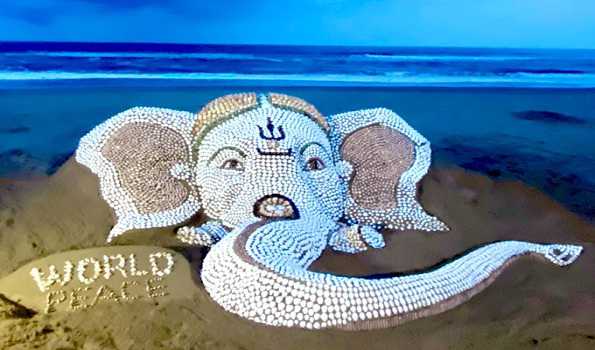 Pattnaik has created a 5ft high sand sculpture of Lord Ganeshs using seashells with the message “World peace” .
