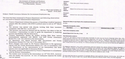 On March 23, 2022 a letter was received from Dr Mohammad Usman Khan, JKAS, Deputy Secretary, General Administration Department, Government of J&K regarding a matter of malpractice in awarding a contract of J&K Government Employees Health Care Insurance Scheme to Reliance General Insurance Corporation Limited.