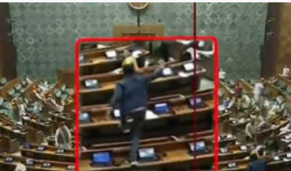 New Delhi, Dec 13 : On the 22nd anniversary of the terror attack on Parliament, a major breach of security was witnessed again in the Temple of Democracy on Wednesday when two men jumped into the Lok Sabha chamber from the Visitors’ Gallery above and caused smoke, leading to chaos and commotion in the House where proceedings were underway.