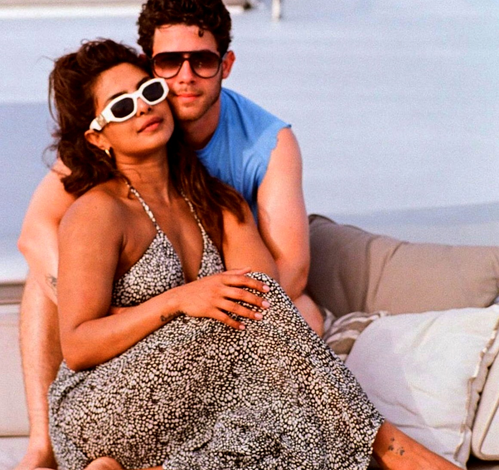 Priyanka is wearing a white and black dotted halter-neck dress paired with white sunglasses, and Nick is in a blue sleeveless tee shirt.