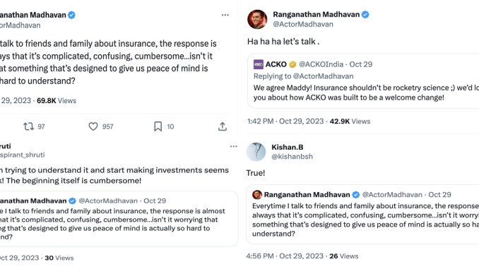 They responded to Madhavan’s tweet, acknowledging the issue that insurance shouldn’t be ‘rocketry science’ and invited the actor to discuss how ACKO is reshaping the insurance space to make it more approachable and convenient for customers.