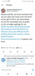Reportedly, Sarojini Agarwal, the sarpanch of Bhaleswar panchayat of Nuapada block of the district has announced that 50 trees will be planted for every birth of a girl child as a message to curb gender discrimination in various forms.