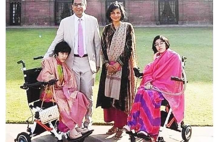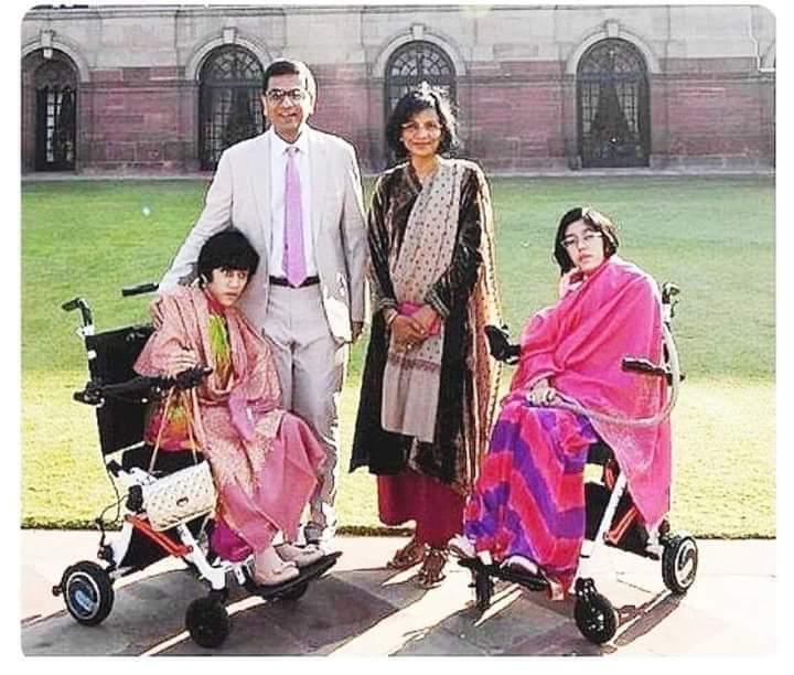 The two daughters “Mahi” and “Priyanka” want to visit their father’s place of work. To fulfill the wishes of his daughters, he took them to his place of work . Supreme Court. The two daughters visited their father’s workplace and were overwhelmed with joy. Their happiness is boundless today. Father is the Chief Justice of the Supreme Court – Hon’ble D Y Chandrachur .Mother Mrs. Kalpana Chandrachur ,two daughters are sitting in wheel chair. The picture is taken in the Supreme Court complex. Mahi and Priyanka are both differently able. Can’t walk without wheelchair. Besides, both are adopted daughters of Chandrachud couple. “THE GREATNESS IN PRACTICE NOT IN THEORY”