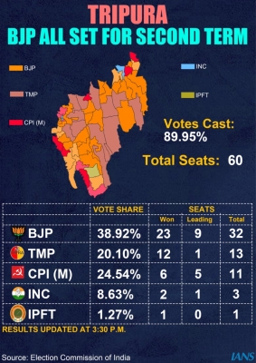 Agartala, March 2: The BJP surged ahead of the Opposition CPI-M-Congress, winning 28 (of total 60 seats) and leading in four seats as the counting of votes in Tripura was underway on Thursday, almost ensuring itself a second consecutive term.