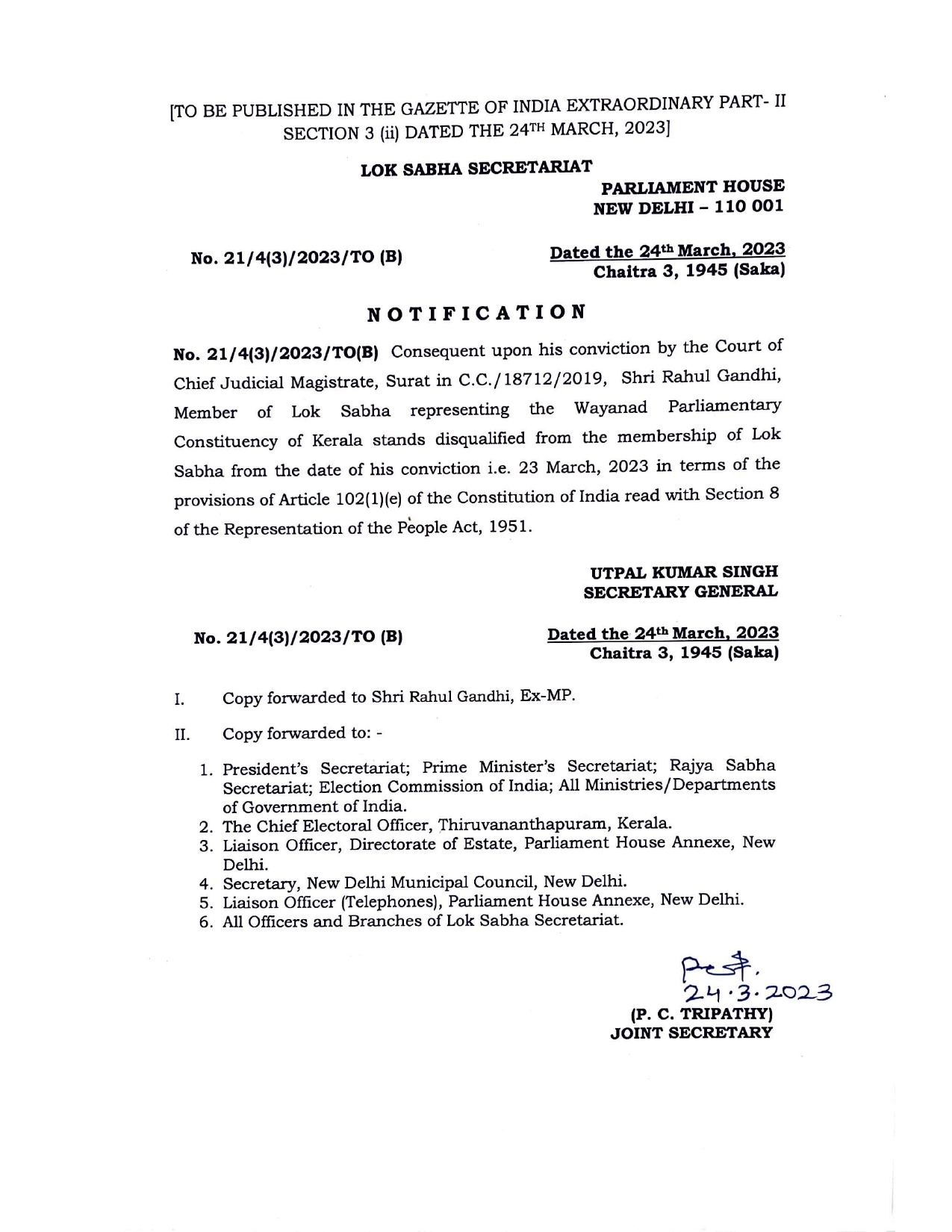 His disqualification as Wayanad MP is effective from March 23, the day of his conviction, the secretariat said in its notification.