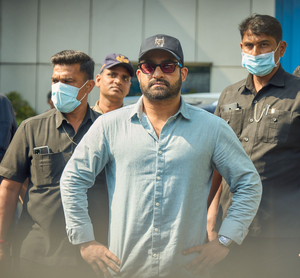 Images on social media show NTR wearing a pastel-blue shirt and blue denims. He topped the look with a black baseball cap, sunglasses, and black sports shoes.