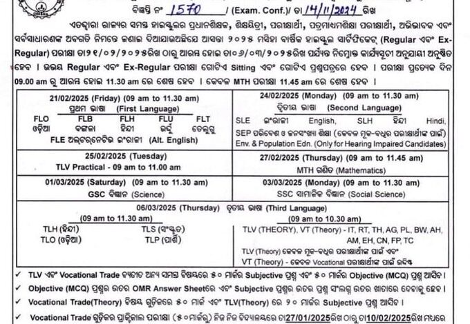 The 2025 Odisha High School Certificate Exam, both regular and ex-regular will begin on the same date and will have one sitting and same question paper.