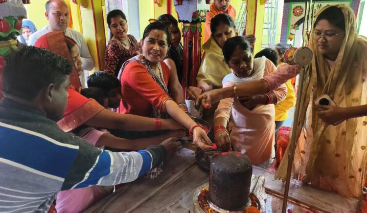 The temple premises resonated with chants and festive cheer as devotees offered abir and gulal to Lord Shiva and showered flowers in celebration. A large number of devotees gathered to take part in the special festivities.