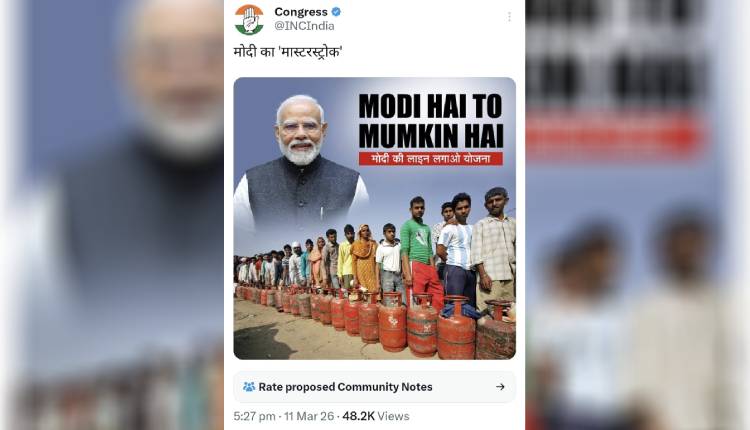 The post featured an image carrying the slogan “Modi Hai To Mumkin Hai,” with a caption below that read “Modi ki line lagao yojana,” suggesting people were being forced to stand in long queues for LPG cylinders. Soon after it was posted, several users pointed out that the photograph used in the post was reportedly from 2011, leading to criticism of the Congress for sharing an outdated image to highlight the current issue.