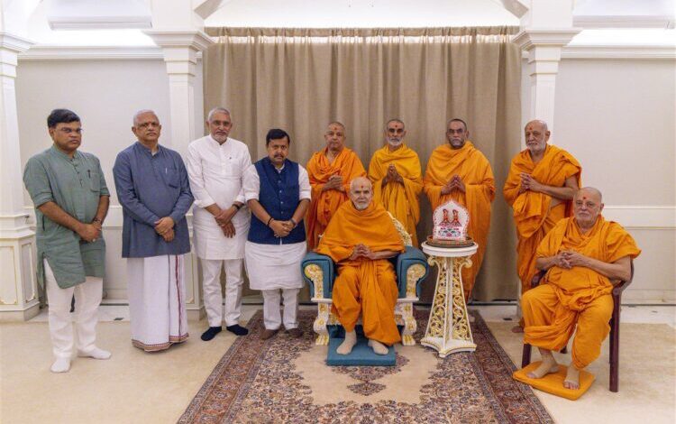 On Friday, Nabin was accompanied by senior party leaders, including Jagdish Vishwakarma, President of BJP Gujarat; B.L. Santhosh, National General Secretary (Organisation); and Ratnakarji, BJP Gujarat Organisation Secretary. The meeting was marked by warmth and reverence as the delegation sought the blessings of Mahant Swami Maharaj.
