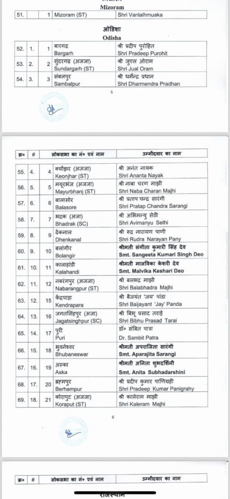 The BJP’s list also includes Pradeep Panigrahi, a new entrant to the party, who has been given the ticket for the Berhampur seat, and Anita Subhadarshini, who will be contesting from the Aska constituency in Ganjam district.