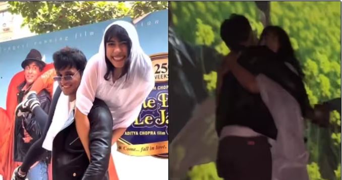 The clip then goes on to show how the duo went to Maratha Mandir while wearing Raj’s leather jacket (SRK’s character) and Simran’s(Kajol’s character) white ensemble. They acted out the famous scene where Raj arrives in Simran’s hometown to profess his love for her. She then runs through a picturesque field filled with saarson phool (mustard flowers) and embraces Raj. Goosebumps, right?