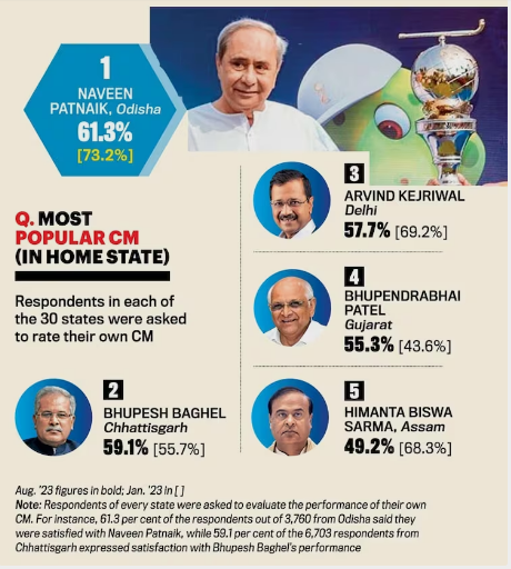 Feature: Chief Minister Naveen Patnaik of Odisha has been voted as the most popular Chief Minister in his home state for the seventh consecutive time, according to the recent India Today Mood of the Nation survey. However, there has been a notable decline in his vote percentage, dropping from 61.3 per cent in August 2023 to 52.7 per cent, which may raise concerns for the ruling BJD as they prepare for upcoming Assembly and Lok Sabha elections.