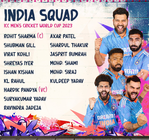 India’s World Cup squad: Rohit Sharma (captain), Shubman Gill, Virat Kohli, Shreyas Iyer, KL Rahul (wk), Ishan Kishan (wk), Suryakumar Yadav, Hardik Pandya (vice-captain), Ravindra Jadeja, Kuldeep Yadav, Axar Patel, Mohammed Siraj, Mohammed Shami, Shardul Thakur, Jasprit Bumrah